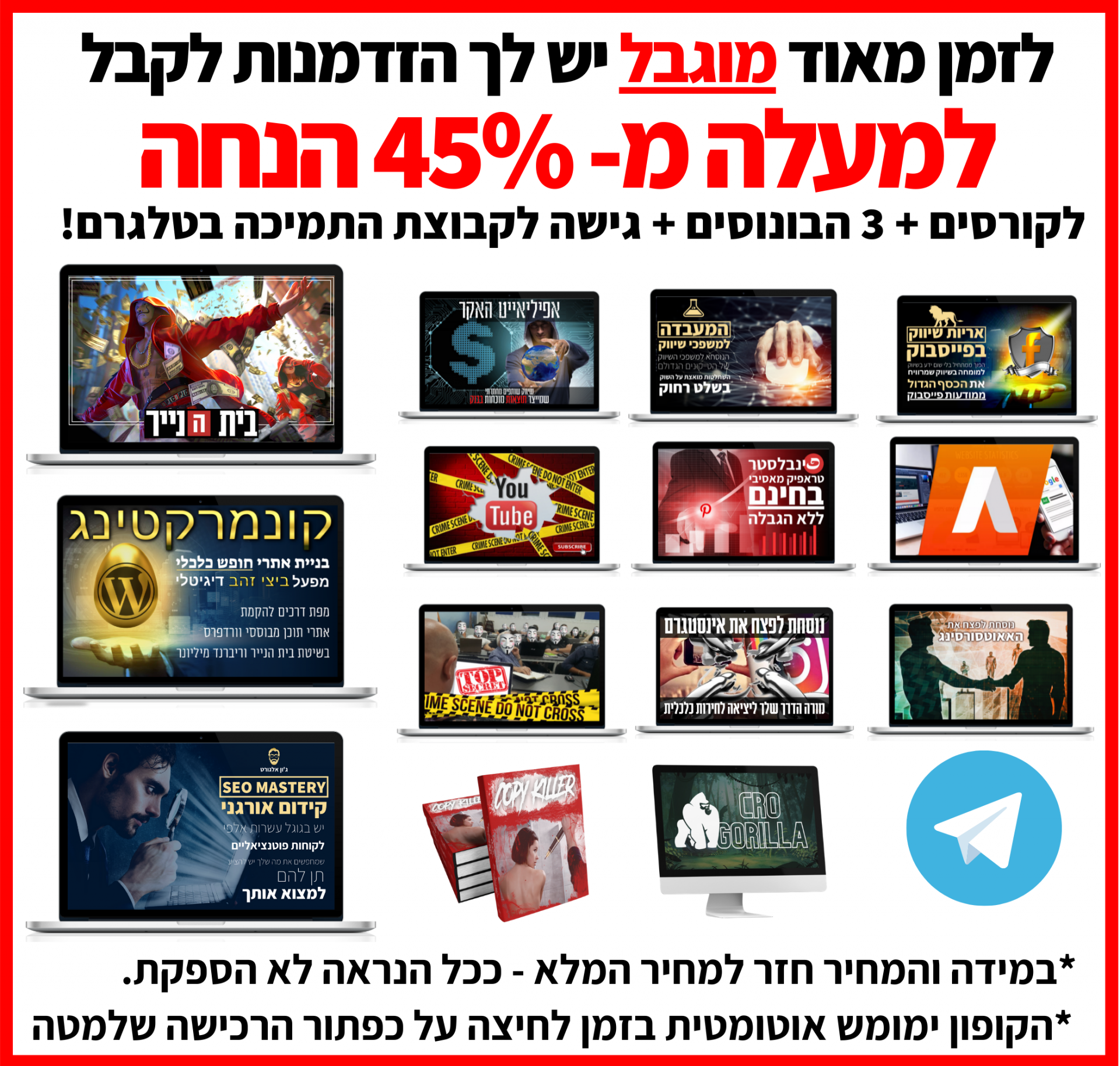 כל החבילה העצומה הזאת + הבונוסים + גישה מלאה לקבוצות הלמידה הסגורות בהנחת ענק של 48%